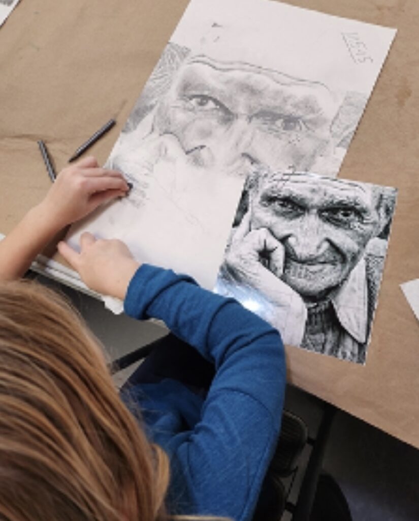 Art 1 is the foundation class of a four-year curriculum, where your Art 1 student will embark on an exciting journey through monochromatic work that deepens their understanding of line, value, and texture. Projects will include ebony pencil portraits, charcoal still life, India ink design, and scratchboard art. Several weeks into the next session, students will study color theory in-depth. They will utilize this knowledge to succeed in color design projects that will ensue.